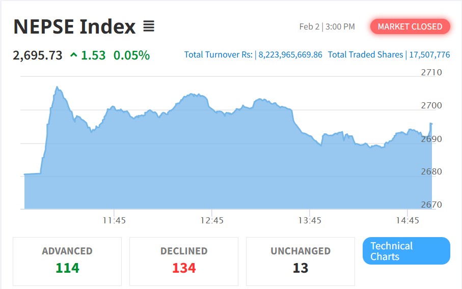 The domestic stock market closed marginally higher on Monday after a volatile trading session, with the Nepal Stock Exchange (NEPSE) index gaining 1.53 points to settle at 2,695.73.